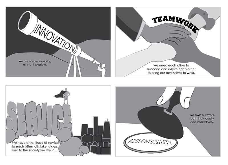 Credo strongly believes that all actions within company should stem from their five core values: service, teamwork, humility & humor, innovation, and responsibility. To reinforce these values, they asked me to create 3’x2′ posters to hang in the office entryway. I decided to illustrate the values and integrate both the value and description into the artwork. The inspiration for these images derived from value badges that my design intern had created previously (featured at the bottom). Credo employees view the company as having a good sense of humor, whimsy and quirkiness, which led me to the decision of designing these posters in a pseudo children’s book style. You can see the process below: I sketched out ideas, created initial low-fi thumbnails in Illustrator for approval, and then rendered them in Photoshop. Below are the final images.